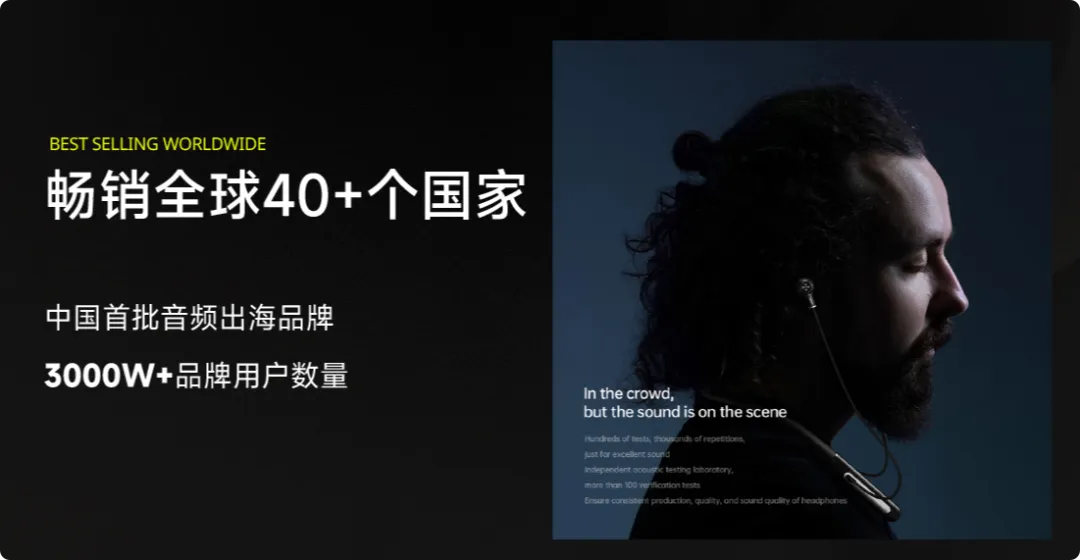 2017 年,产品覆盖全球超 40 个国家,用户突破 1000 万。至 2023 年,全球用户已突破 3000 万,并构建起涵盖 TWS 耳机、开放式耳机、电竞耳机的完整音频生态,手握 50 多项专利,成为国内无线音频出海的标杆之一。