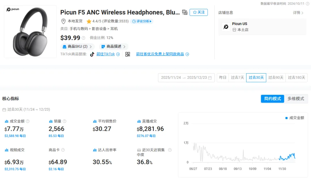 2024 年 10 月,Picun 正式入驻 TikTok 美国站。短短数月后,其 F5 ANC 耳机便创下单月销量突破 5314 台、销售额超 20 万美元的佳绩,迅速跻身类目头部。