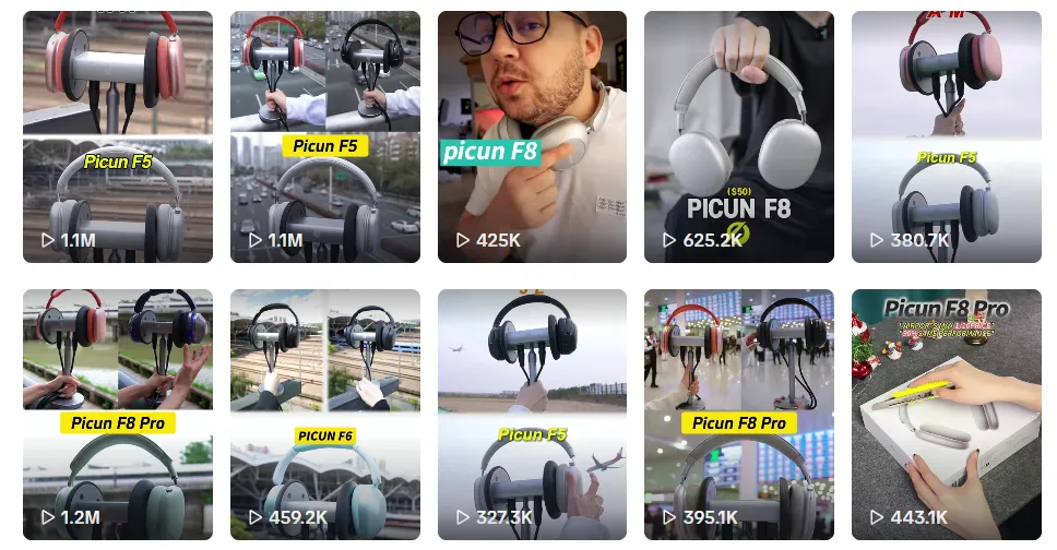 早期 Picun 所采取的内容模式以产品展示为主,他们在官方账号 @picun_us 上发布大量高噪音环境下的降噪对比视频,通过环境噪音与耳机降噪效果的反差,让用户“看见”技术差别。