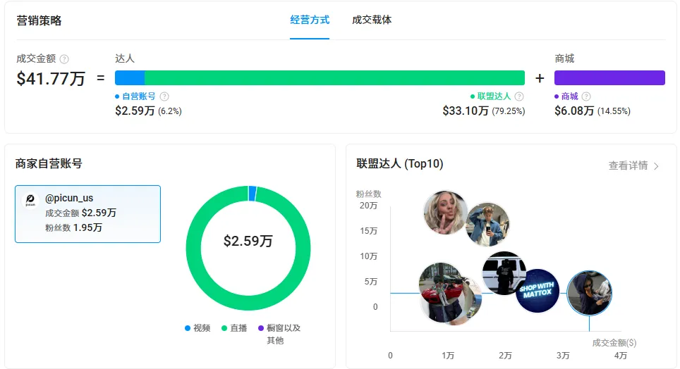 从数据来看,近 30 天内 Picun 品牌美区小店的总体交易额达到约 41.77 万美元,其中由达人贡献的销售额就占据了约 33 万美元。