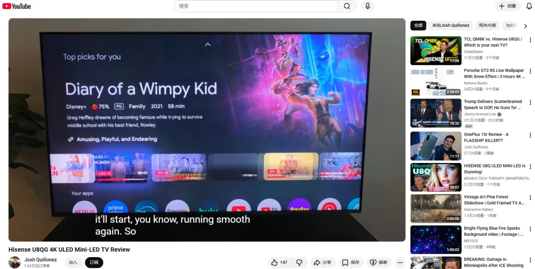 在 YouTube 上,与独立科技评测频道合作进行电视深度评测内容,@Josh Quiñonez围绕海信 U8QG 系列 4K Mini-LED 电视展开详细演示,包括亮度表现、画质对比与游戏性能展示,从专业视角逐项拆解产品卖点,适合中高端家庭娱乐场景消费决策。该视频播放量已达万次,并在评论区有大量用户围绕“亮度/色彩/游戏模式”等核心功能展开讨论。该类深度评测内容有效覆盖家庭娱乐、游戏用户这类决策周期较长的消费群体,有助于构建产品技术信任与用户购买逻辑。