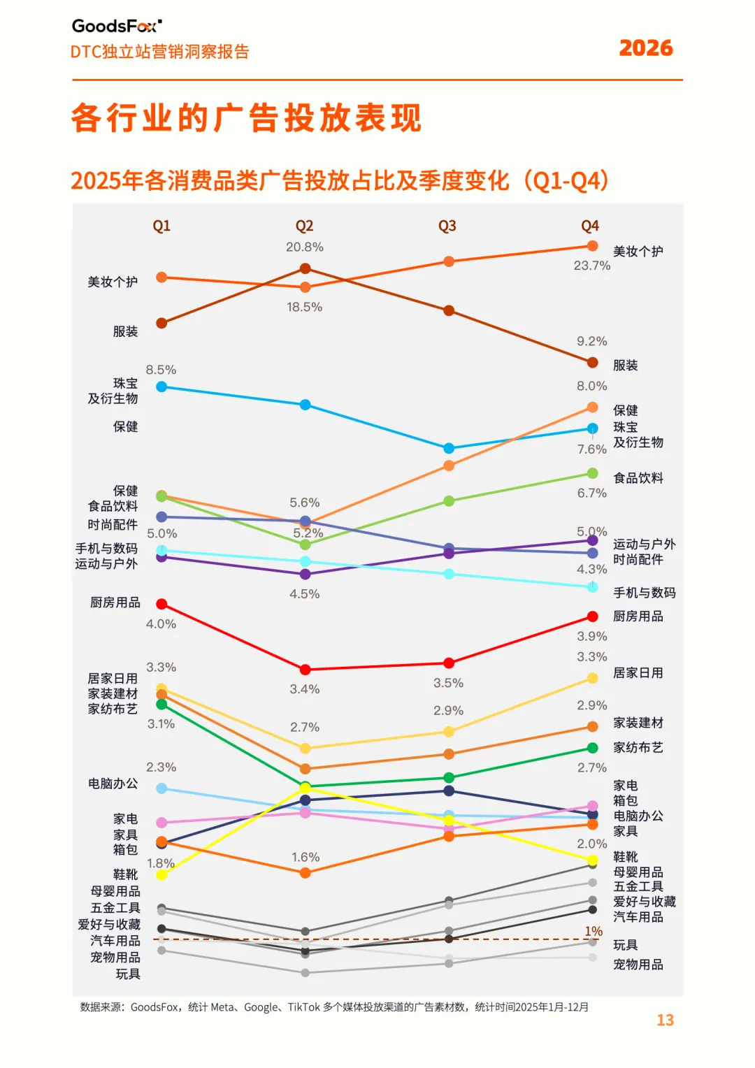 基于全球的投放数据,GoodsFox 重磅发布《2026全球DTC独立站营销洞察报告》,系统梳理了2025年跨境市场的流量走向、投放结构与消费变化。