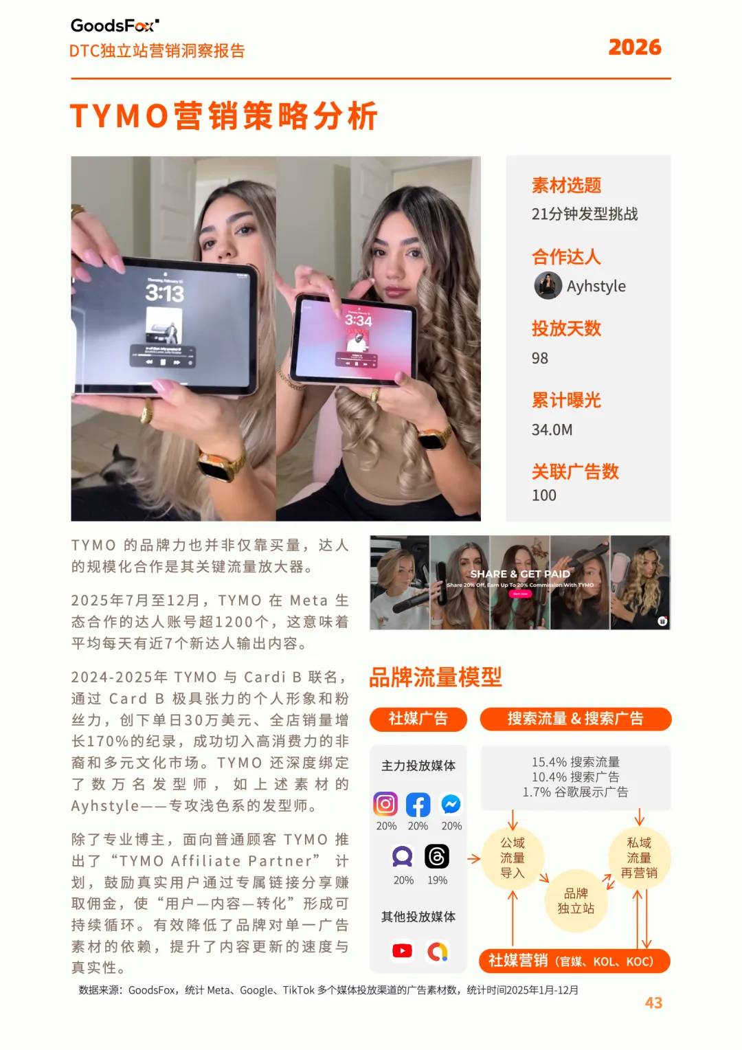 报告数据显示,TYMO 的广告素材中,竖屏短视频占比高达 97.5%,与传统 DTC 品牌依赖静态图的逻辑迥异,更接近于内容电商的高频沟通模式。