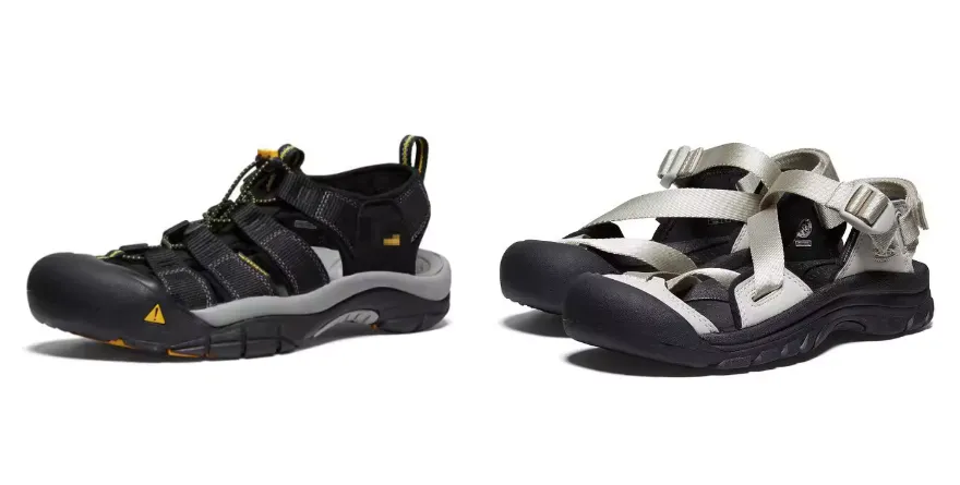 全包 / 半包鞋头 + 后跟固定带 + 深纹路防滑橡胶底 + 排水孔 + 速干网布 / 合成革,防摔、防踩掉、不闷脚
