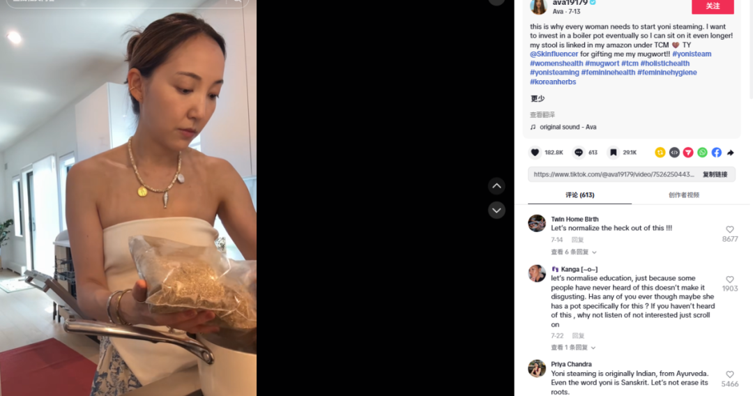 7 月 13 日,@Ava 作为美容护肤、健康养生领域的达人,分享了关于蒸汽浴教程,视频中博主从摆放蒸汽浴工具到使用艾草煮水到蒸汽浴效果展示,吸引了许多用户关注,获得 220 万次播放,超 18.2 万次点赞。这个一个健康养生的疗愈视频,大家对使用的浴水草药非常感兴趣,艾草被疯狂种草至养生网友。