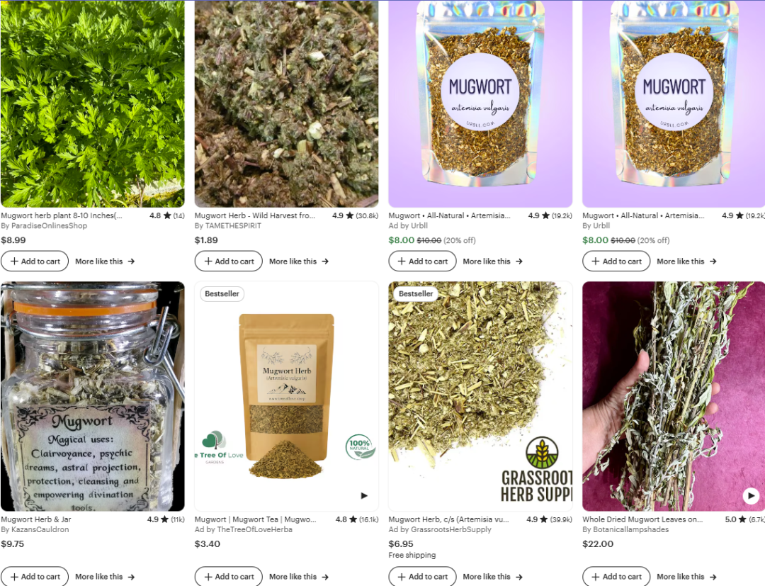 在 Esty 上,艾蒿碎、干艾蒿、艾草制品等品类多样,艾蒿售价在 1.89 美元—37.4 美元之间。其中,一款售价为 2.58 美元的切碎干艾蒿,卖出 19.13 万单,销售额超 49.35 万美元(约人民币 354.39 万元),单价 3.4 美元一包的艾草茶卖出 9.75 万单,总销售额超 33.15 万美元(约人民币 238.83 万元)。
