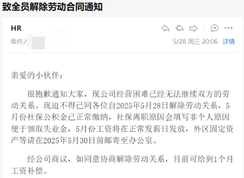 5 月 28 日 20 点左右,跨境好运员工又收到《解除劳动合同通知书》,被告知因公司经营困难,已经无法继续双方的劳动关系,迫不得已同所有员工自 2025 年 5 月 28 日解除劳动关系。在赔偿方面,员工仅能获得一个月工资补偿。