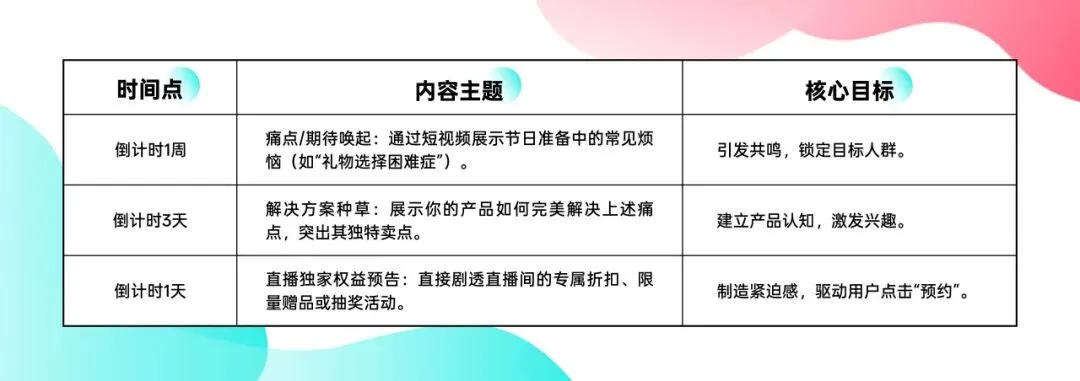 在直播前两周,通过短视频进行集中预热是拉升预约量的关键。预热内容需有清晰的节奏: