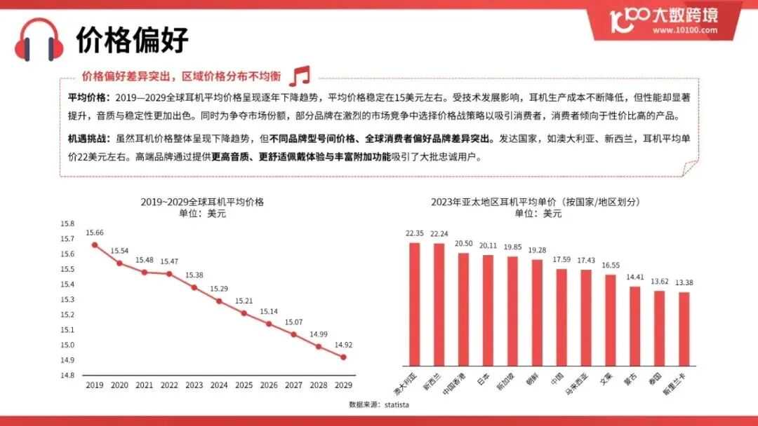 按地区划分,全球二级市场亚太地区以 36% 的市场份额位居第一,其次是北美、欧洲、拉丁美洲、中东及非洲。值得注意的是,价格偏好上,2019~2029 全球耳机平均价格呈现逐年下降趋势,发达国家的耳机平均单价在 22 美元左右,中国地区平均单价在 17.59 美元左右。