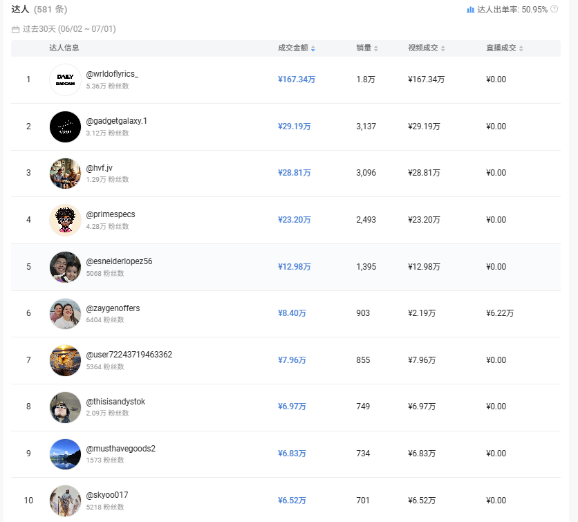 观察近 30 天销售数据,主要销售额来自短视频,其中销售额排行前十的KOL,仅有一人靠直播成交。销量最高的 KOL 为 @wrldoflyrics,近 1 个月,成交金额为 167.34 万,均为视频成交,销量达 1.8 万件。