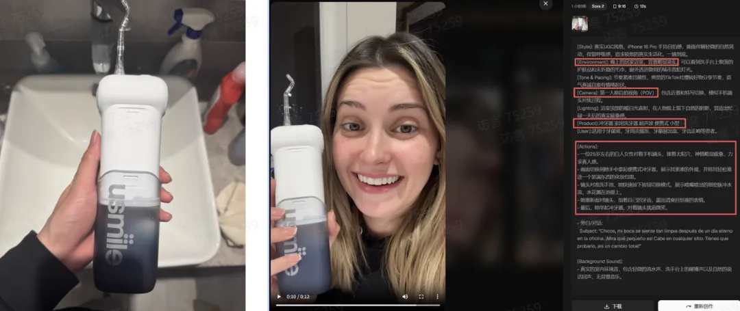 错误表现:使用情绪 / 抽象感受词(显得很方便、让人安心、看起来牢固、不廉价); 直接后果:AI 自行脑补,产品形态变化、画面偏离预期; 经典转化案例: 不说「看起来牢固」→ 说「左手握住产品底部,右手轻晃产品上方,产品无位移、无晃动」; 不说「使用很方便」→ 说「单手完成产品拆封 + 安装,全程不超过 5 秒,无需借助其他工具」。