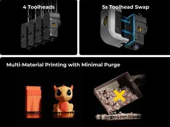一是直击“高效低耗”的需求,其搭载的四头自动换刀系统实现5秒换色/换材;Snapmaker U1 声称:“这种高效技术可使多色打印速度提高 5 倍,并将耗材浪费减少 80%。”