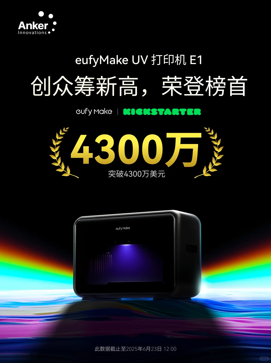 直至今年将品牌调整为 eufyMake,以首款消费级 3D 纹理 UV 打印机 E1 重启征程。凭借小巧机身、多材质兼容、全彩 3D 纹理等优势,E1 上线 12 小时众筹破千万美元,最终以 4300 万美元刷新 Kickstarter 全品类纪录,成为现象级爆款。