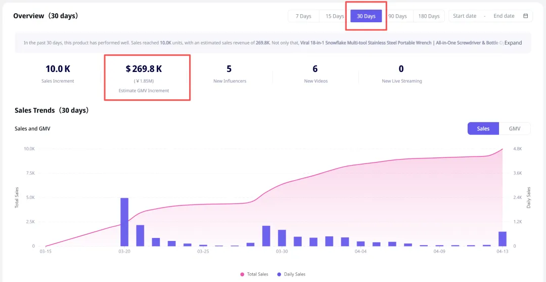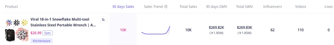 根据EchoTik数据,这款来自 SmartDP 的雪花扳手的表现堪称“现象级”。