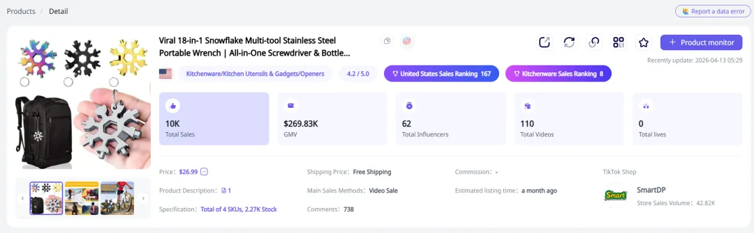 它在3月15号才上线,这款多功能雪花扳手总销售额接近27万美元,卖出了1万单!