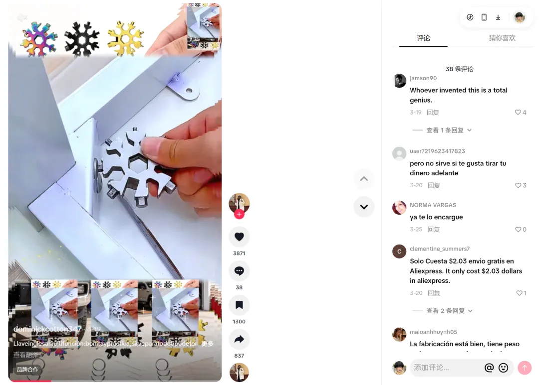视频中,博主不断切换场景:拧螺丝、开啤酒、修自行车、拆快递……这种“一个小挂件搞定大麻烦”的即视感,对于美国消费者来说,几乎不需要思考,同时满足了用户的情绪价值,极易触发冲动消费。
