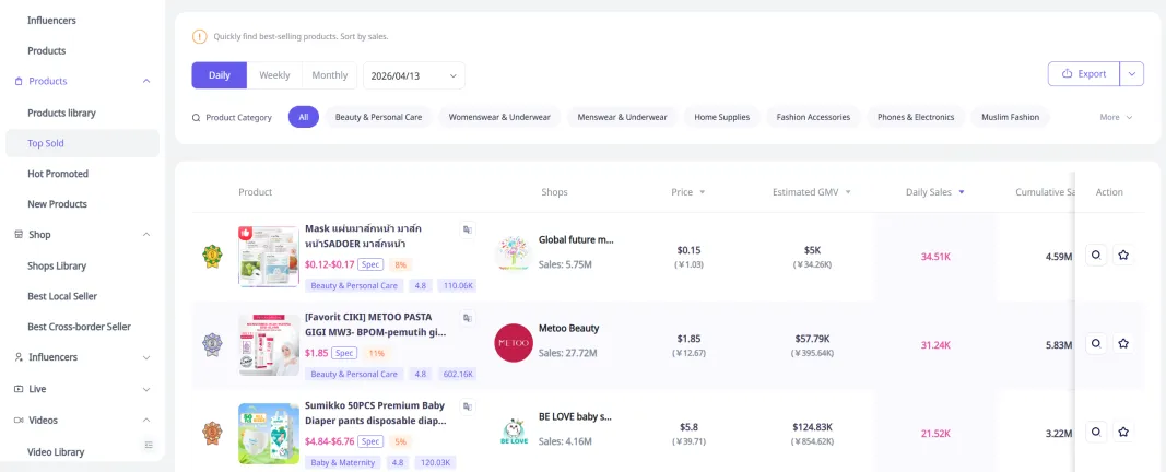 很多卖家选品靠感觉,而高手选品靠数据。通过EchoTik等专业TikTok数据分析工具,你可以实时监控类目GMV增长,快速锁定那些“正在爆、还没烂大街”的潜力品。