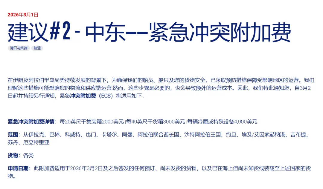 成本压力迅速传导至货主端。各大船公司掀起附加费上调潮。达飞轮船宣布收取紧急冲突附加费(ECS),覆盖伊拉克、阿联酋、沙特等十余国,标准为 20 尺柜2000美元、40 尺柜 3000 美元,冷藏箱高达 4000 美元,自 3 月 2 日起生效。