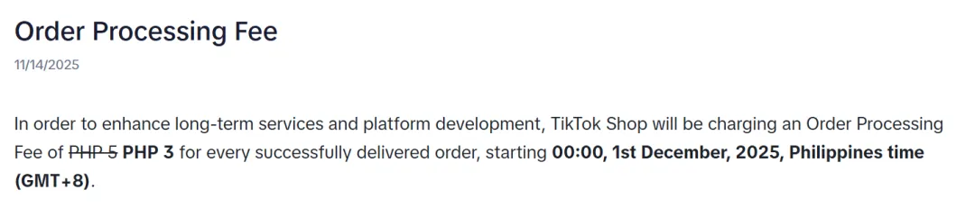 这种担忧并非无迹可寻。此前订单处理费的行业传导已有先例 ——TikTok Shop 曾于 2025 年 11 月发布公告,自 2025 年 12 月 1 日起,对菲律宾站点成功配送的订单收取订单处理费。
