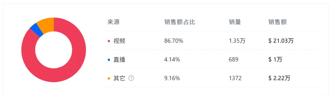 数据显示,近30天,产品共计售出1.57万单,达成GMV 24.45万美元(约为167万人民币)占到其上线一年时间总销量约1/3,说明产品销量暴涨基本集中在近一个月的时间里。销售额来源渠道来看,内容带货的GMV占比超90%。
