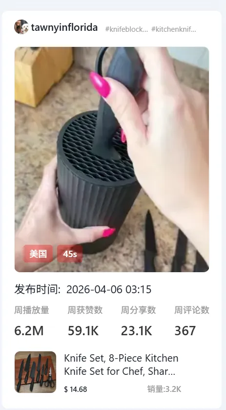 TT123观察到,数据显示,近期,一款8件刀具+刀桶的套件在一则620万+播放的爆款带货视频的推动下,热度迅速飙升,该视频在过于一周时间内驱动了约3200单的销量转化,拉动产品一跃成为TikTok美区视频带货榜上炙手可热的单品。