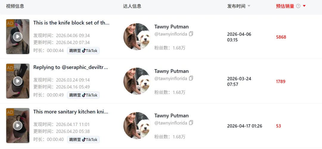 从中预估销量排名靠前的视频中不难看出,在运营打法上,卖家集中发力尾部达人,通过同人多角度、反复触达的策略,对同一潜在用户群体进行高频次曝光,有效拉高转化率。同一达人出镜确保了种草内容的连贯性与信任感,形成系列化记忆点。一旦其中一则视频出圈,便能迅速拉动同系列其他视频的流量,释放爆款内容的长尾价值。