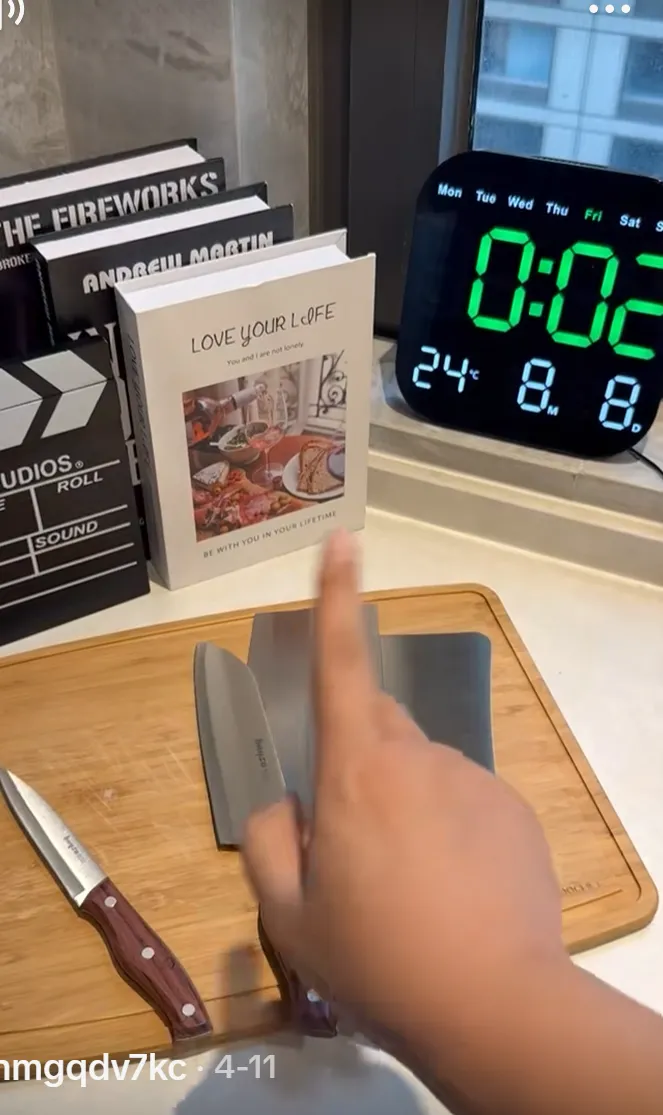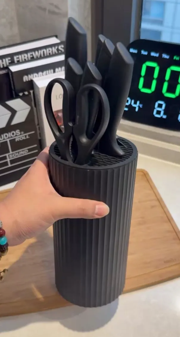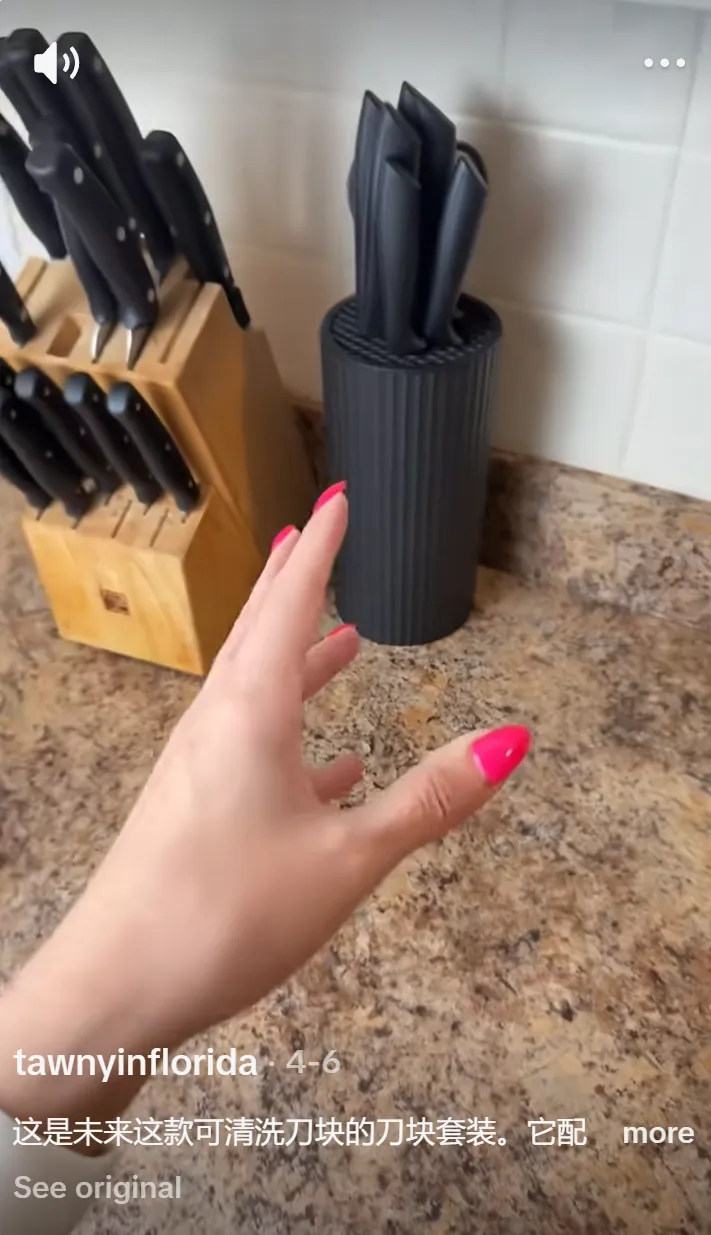 在由达人@tawnyinflorida发布的一则爆款视频中,博主首先展示出厨房刀具数量多,收纳混乱的痛点,而后掏出这款8合1的刀具套装,展示了随插随收纳,以及其多功能的特点,顺带对比并吐槽了老式刀具收纳的操作上的冗杂,细节多不易清洗,还可能会发霉的诸多问题,向屏幕前的种草安利。