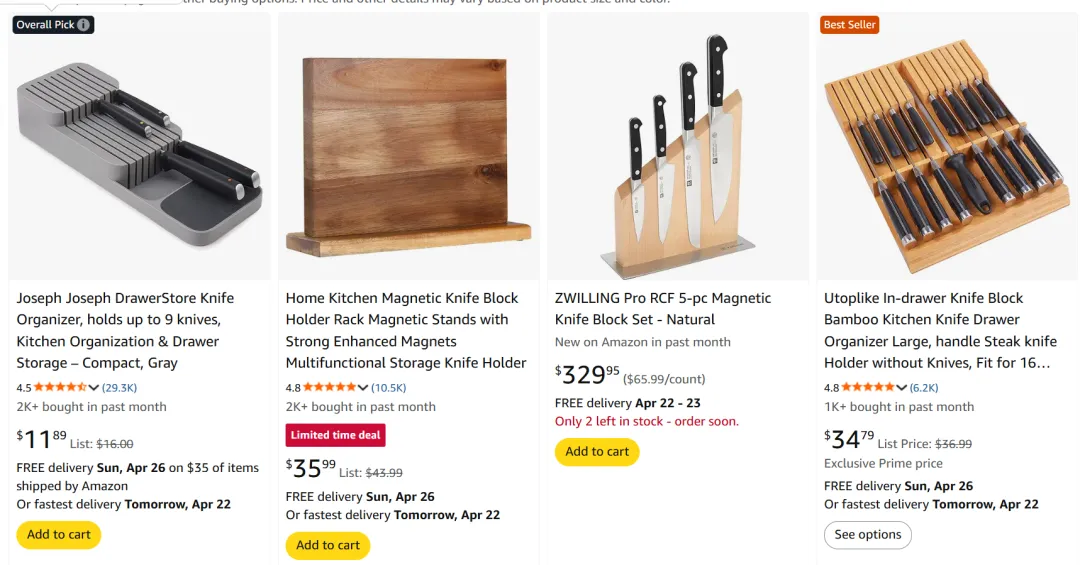 另外在亚马逊,相关产品的销量和热度也可圈可点。不同于TikTok Shop,亚马逊上的刀具收纳产品价格跨度较大,功能也更为丰富,比如磁吸式刀架、满足用户外出携带(如露营、野餐、租房搬家)的收纳需求的布艺刀套。
