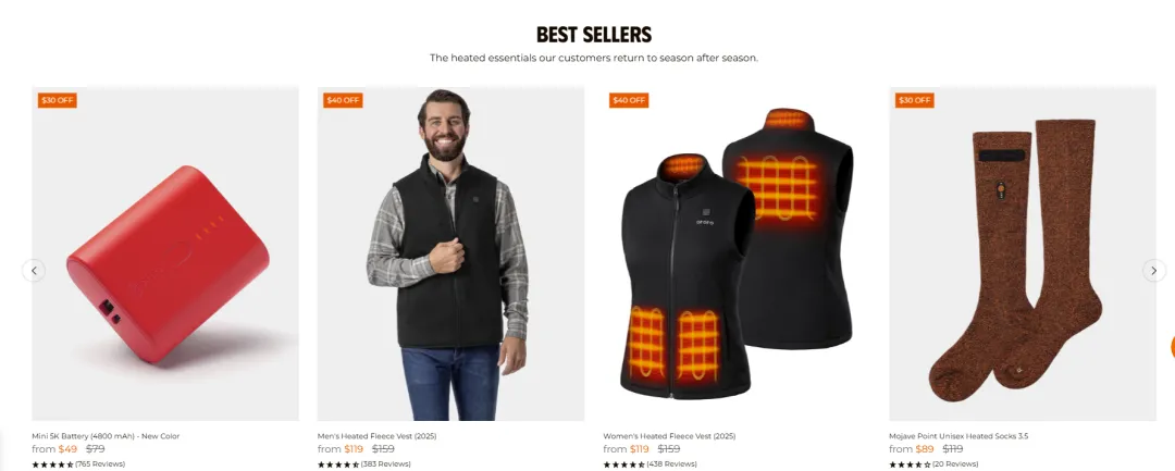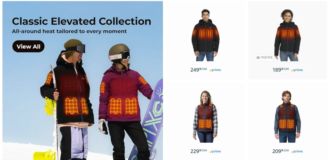 亚马逊上聚焦加热马甲、加热夹克等核心单品,凭借差异化功能与优质评价,常年稳居亚马逊同类目 BS 榜前五。