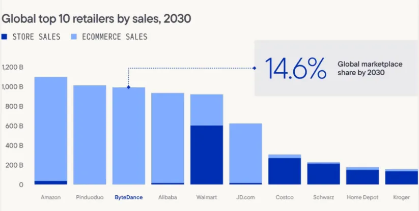 近日,数字商务咨询公司Flywheel飞未发布的一份前瞻报告预测,字节跳动有望在2030年跻身全球零售商前三强,并拿下14.6%的全球市场份额,推动约1万亿美元的销售额。