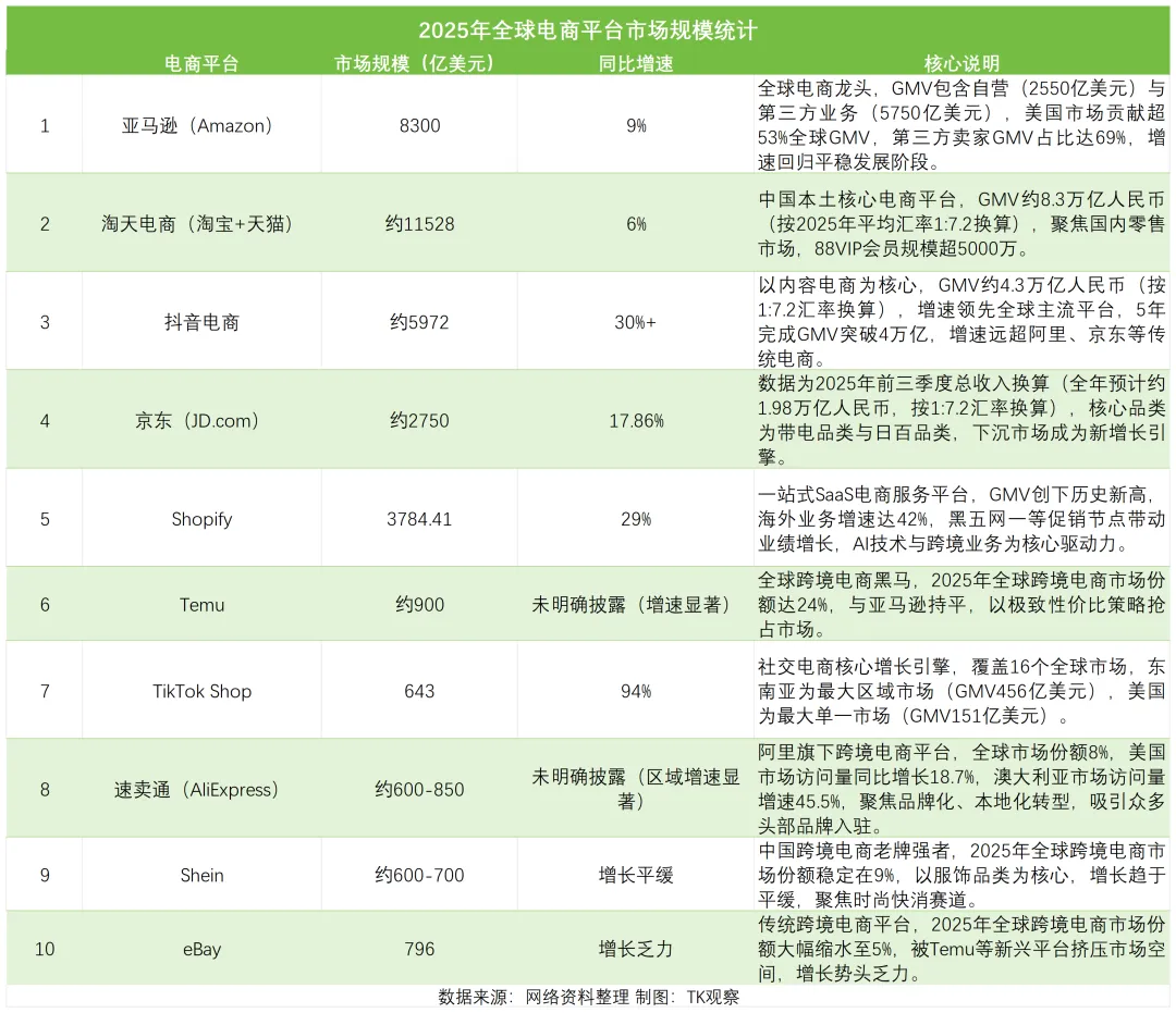 TK观察的回答是,当下布局TikTok Shop仍有机会,但这份机会将随着平台的持续爆发、生态不断成熟逐渐缩小,直至消失殆尽。这一判断是基于TikTok平台当前增长态势,以及全球电商发展规律总结出的,与平台实际发展轨迹贴合程度相对较高。具体来看,TikTok目前仍处于高速增长的黄金周期,自海外上线以来,平台仅用短短五年时间,便从寂寂无名,成功跃升至全球电商平台TOP10席位;若剔除国内电商平台,聚焦海外市场排序,TikTok Shop已稳稳迈进海外主流电商平台头部梯队,逐渐赶上率先出海的速卖通、SHEIN等“出海三小龙”的脚步,足以证明平台爆发的潜力之大。更值得关注的是其增长速度,根据Kalodata数据显示,2025年TikTok Shop全球GMV超620亿美元,同比增速高达95%。这一增速遥遥领先于亚马逊、eBay等传统电商平台,甚至远超行业平均水平,可以说是全球电商领域当之无愧的“增速之王”。
