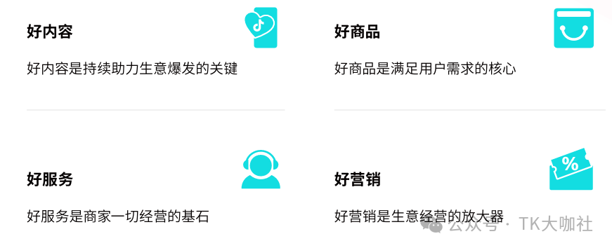各种因素环环相扣,构成了商家在TikTok Shop平台经营的四个核心导向: 好内容、好商品、好服务、好营销。