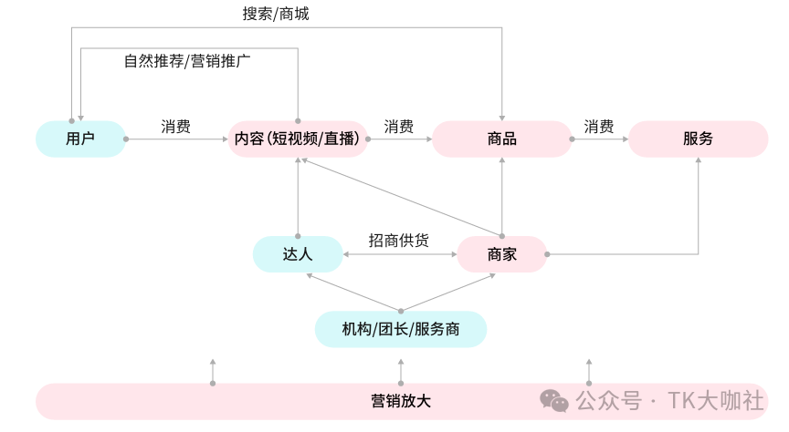 TikTok用户是第一优先级,内容是用户使用TikTok的原始动力,在用户消费内容的过程中,TikTok商品通过直播、短视频等方式被用户看见并触发了购买,在商品履约过程中同时伴随着用户对商家服务的消费。