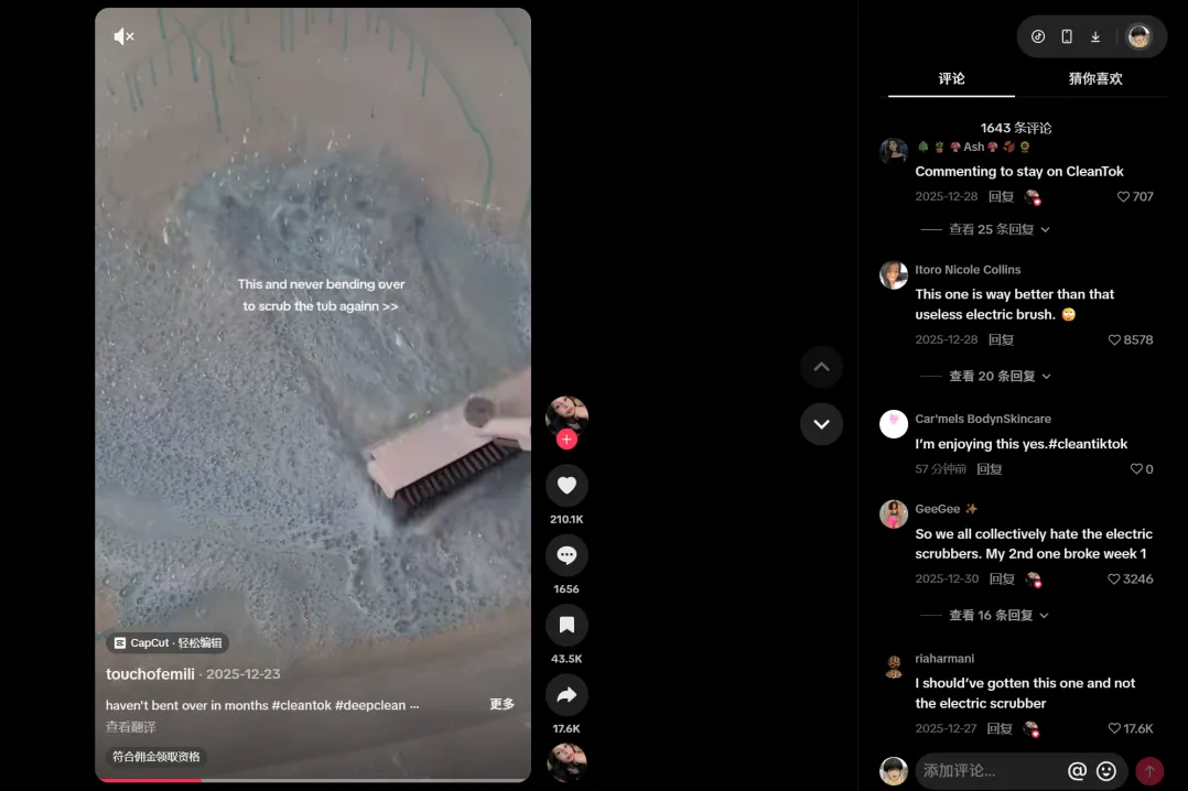 在TikTok一条展示清洁刷清理浴室死角的视频,获得了千万级别的播放量。