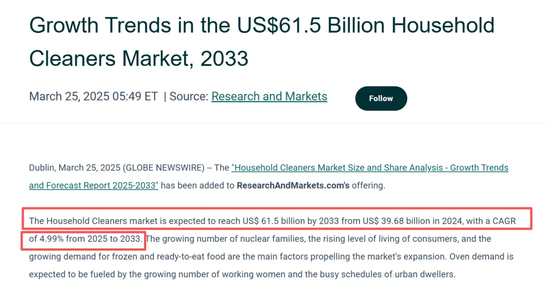 2033年美国家庭清洁用品市场收入将达到615亿美元,行业未来几年预计保持约4%-5%的稳定增长。