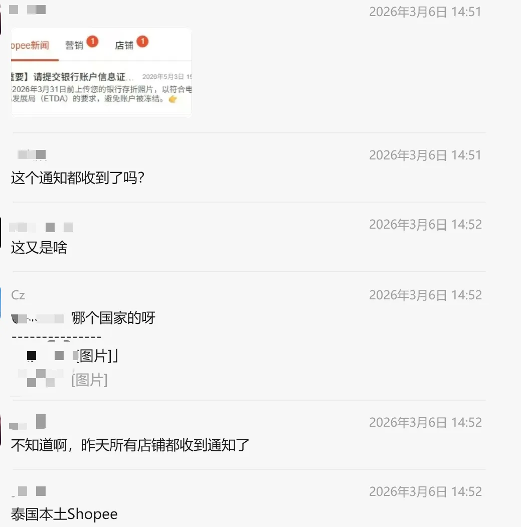 近日,多位泰国本土Shopee商家反馈,3月5日当天所有店铺均收到平台官方通知:2026年3月31日前必须上传银行存折照片,完成银行账户信息核验,此次要求是为符合泰国电子交易发展局(ETDA)的监管规定,逾期未完成者将直接面临账户冻结的处罚。