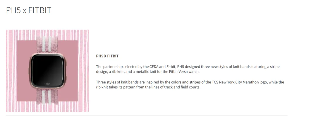 时尚联名破圈:重塑穿戴属性 与CFDA支持的纽约品牌PH5合作推出Versa联名腕带,由设计师Wei Lin打造运动风针织款式,通过Instagram时尚红人、穿搭博主拍摄街拍内容,同步在品牌官方账号发起“#FitbitStyle”话题,鼓励用户分享腕带搭配,将智能设备融入时尚场景,联名腕带上线首月销量占Versa系列总销量的22%。