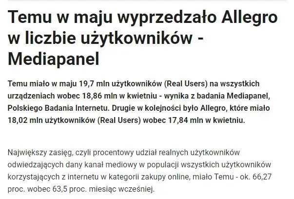 而 2023 年年中进入波兰市场的拼多多 Temu,仅用了 2 年已经获得初步成功。众所周知,Allegro 被誉为“波兰国民平台”,而今年,Temu 已多次超越 Allegro 登顶波兰电商市场第一,可见其实力不容小觑。