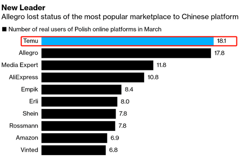 Temu波兰真实用户数量超越Allegro 图源:Bloomberg