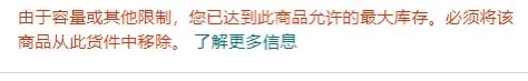系统显示,“根据预测需求,该产品已有 100 天的最大供应量,请从本次货件中移除该物品,或申请例外以发送更多数量”。