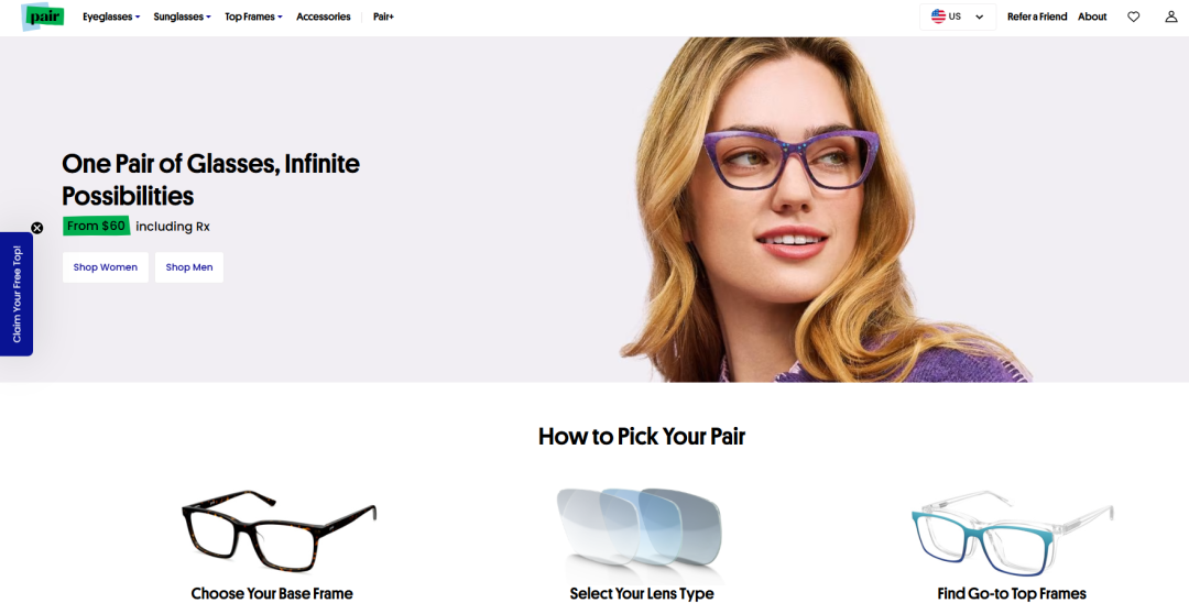 更聪明的是,Pair 把 “性价比” 玩出了新花样。传统品牌换副镜框动辄 200 美元,而 Pair 用户花 85 美元就能拥有 “1+1” 的组合,后续每加一个风格只需 25 美元。这种 “基础款一次投入,个性款低价尝鲜” 的模式,让 Z 世代既能负担得起,又能不断解锁新鲜感,复购周期直接从 18 个月压缩到 3.2 个月。
