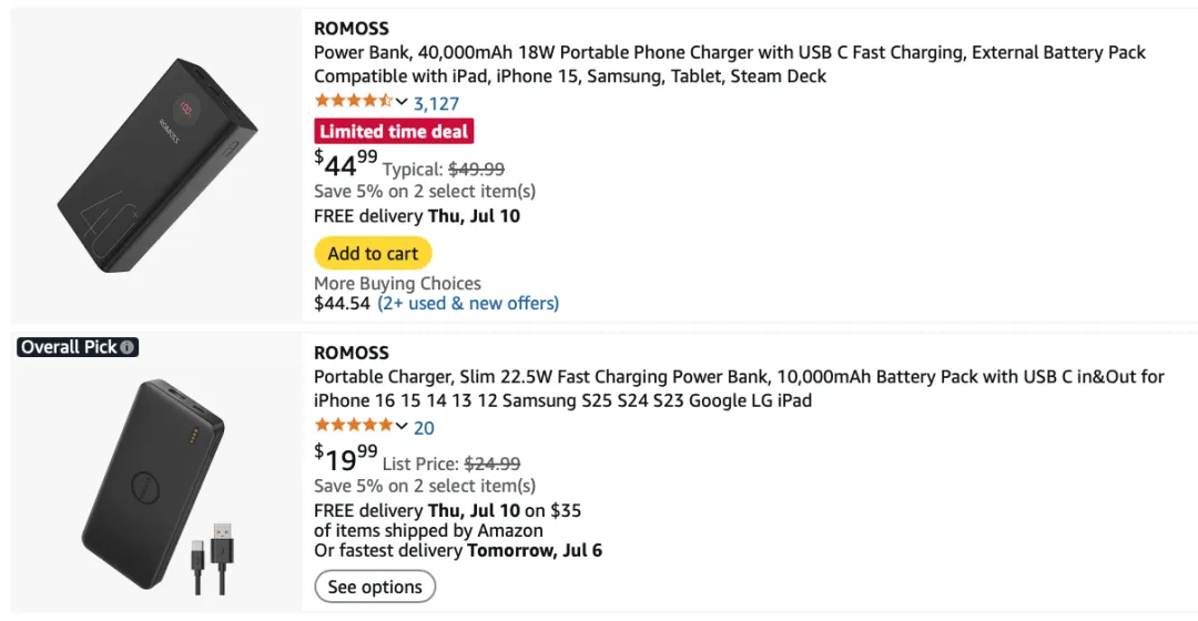 在亚马逊,罗马仕 ROMOSS 在甚为红海的 3C 类目,有着多款热销产品,占据重要市场份额。