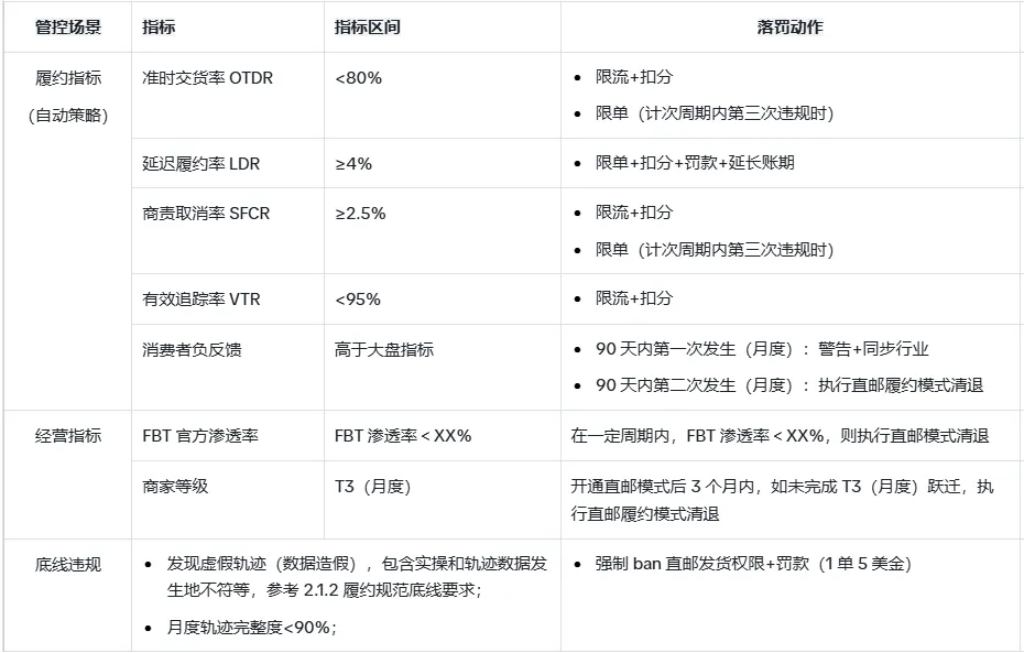 • FBT 全店渗透率:商家需在规定周期内达到平台设定的 FBT(TikTok 官方仓配一体化服务)渗透率目标(具体数值需以 AM 经理通知为准),未达标将取消直邮权限;