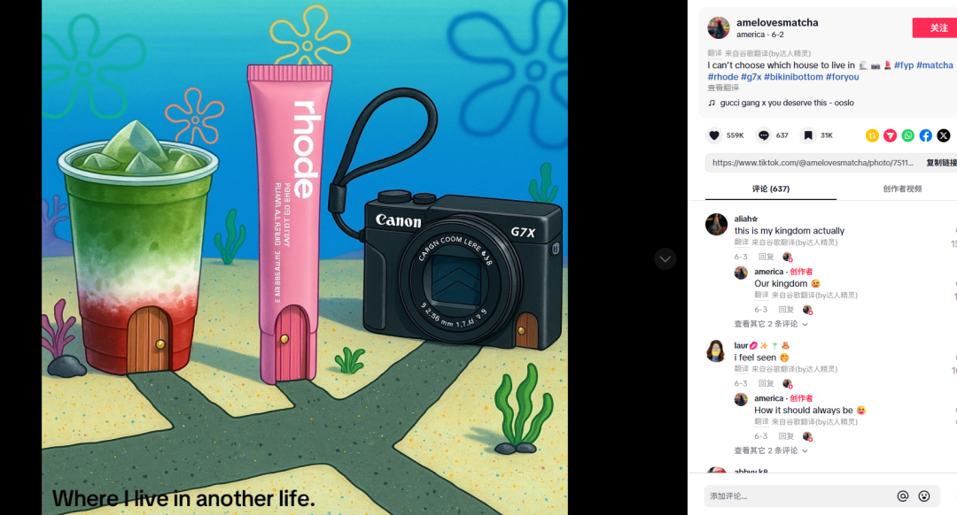 博主 @amelovesmatcha 更将 Rhode 粉管唇釉、饮品、相机,统统画成《海绵宝宝》里的「菠萝屋」造型,配文 I can’t choose which house to live in。这条图文斩获 百万播放、十万互动,网友跟风留言 「this is my kingdom actually」—— 通过「童话场景联想」,让产品从护肤工具,变成「生活美学的具象符号」。
