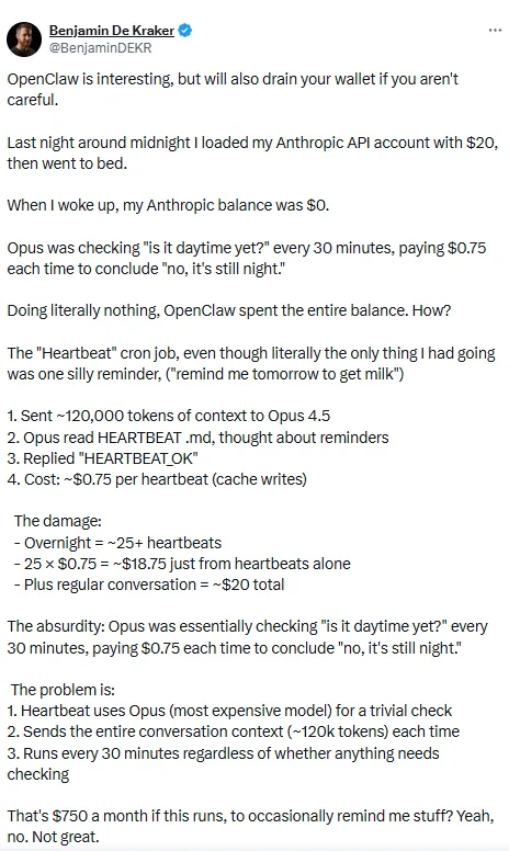 OpenClaw本身免费,但调用大语言模型产生的Token消耗是核心成本,若不加以优化,很容易花钱如流水。有海外用户反馈,仅一个“心跳检查”功能,一夜就烧掉20美元Token,按此计算每月成本高达750美元;国内也有卖家表示,若零散使用而非全流程运营,OpenClaw会变成“Token喷射机”,一晚上就能跑完一个月预算。