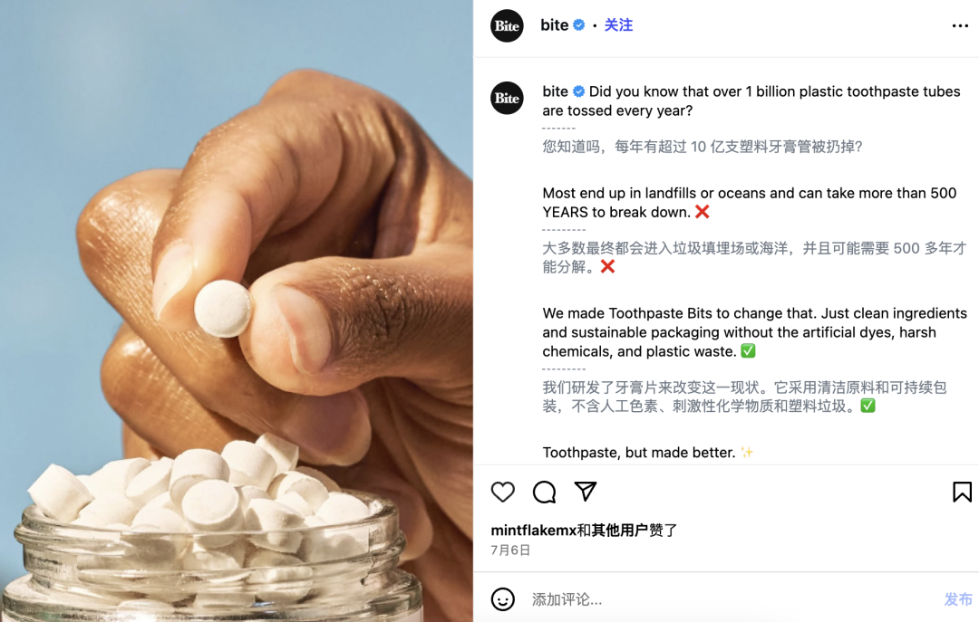 Bite的核心营销“武器”是塑料污染危机,像“防止超过一百万个塑料牙膏管进入垃圾填埋场”这类呼吁式的标语常常出现。品牌的社媒和博客充斥着关于塑料垃圾的令人恐慌的统计数据,这使得他们成为倡导者和问题解决者,而不仅仅是商家。让消费者感觉他们的购买是在为环保事业做贡献,而不只是为了个人的消费,进而对品牌产生深刻共鸣。