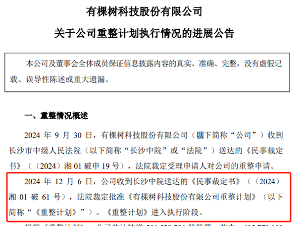 2024 年 3 月 12 日,长沙中院根据债权人的申请决定对有棵树公司进行预重整,并于同日指定有棵树公司清算组担任临时管理人。2024 年 9 月 30 日,长沙中院裁定受理债权人对有棵树公司提出的重整申请,并指定有棵树公司清算组担任管理人。2024 年 10 月 14 日,长沙中院作出《决定书》,准许有棵树公司在管理人的监督下自行管理财产和营业事务。2024 年 11 月 16 日,有棵树公布发布《重整计划草案》,确认天行云和福建纵腾为重整产业投资人。2025 年 3 月,有棵树发布《重整计划》进展情况,称股份已过户至产业投资人指定持股主体名下。