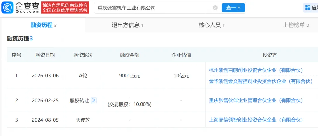 张雪机车融资情况,图源:企查查