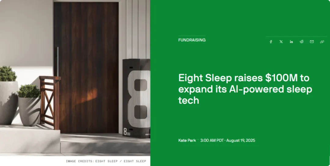 高光时刻在 2025 年 8 月到来,Eight Sleep 宣布完成 1 亿美元 D 轮融资。此轮融资后,公司估值已接近 10 亿美元,跻身准独角兽行列。
