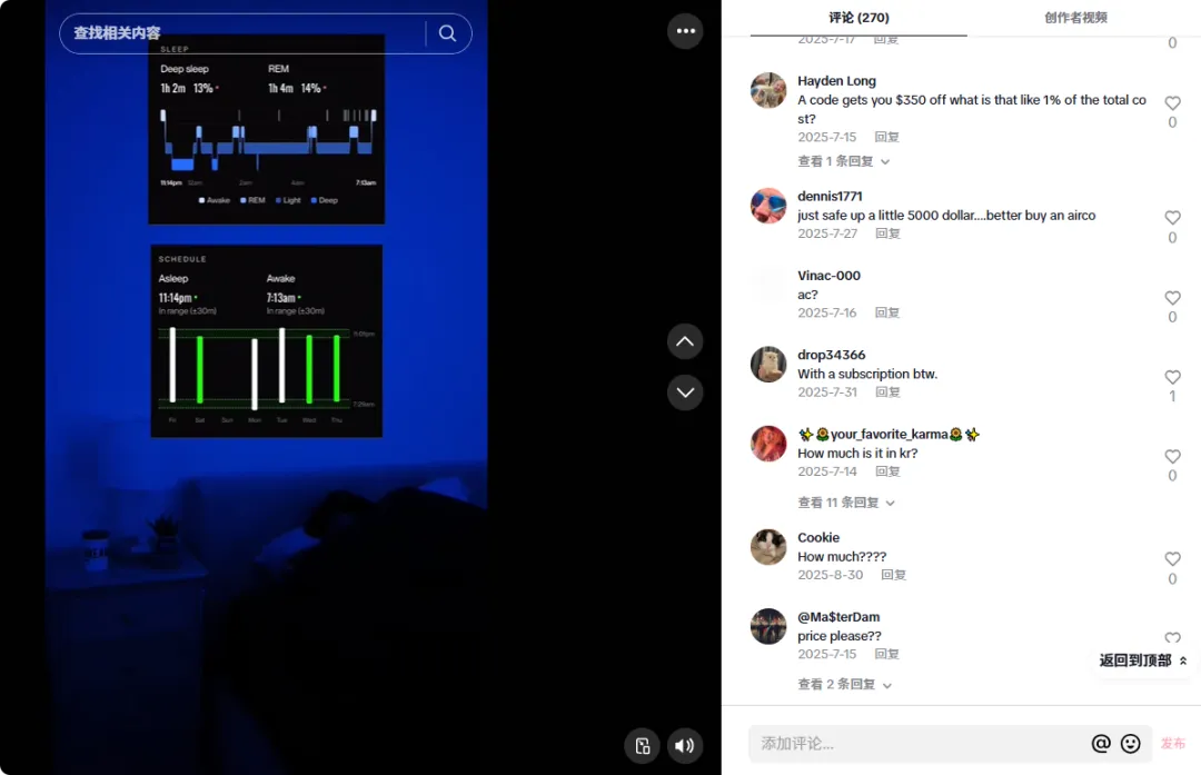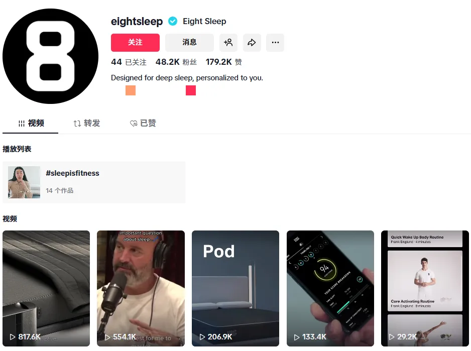 Eight Sleep 品牌的官方 TikTok 账号 @EightSleep 目前拥有约 4.8 万粉丝,内容以专业运动员种草短片、用户使用场景反馈和品牌方解答为主。这种 “非广告式” 的内容,恰好契合了 TikTok 用户对真实体验的偏好,尤其对一款均价在 4000–6000 美元的产品来说,真实的睡眠改善案例比硬广更有说服力。